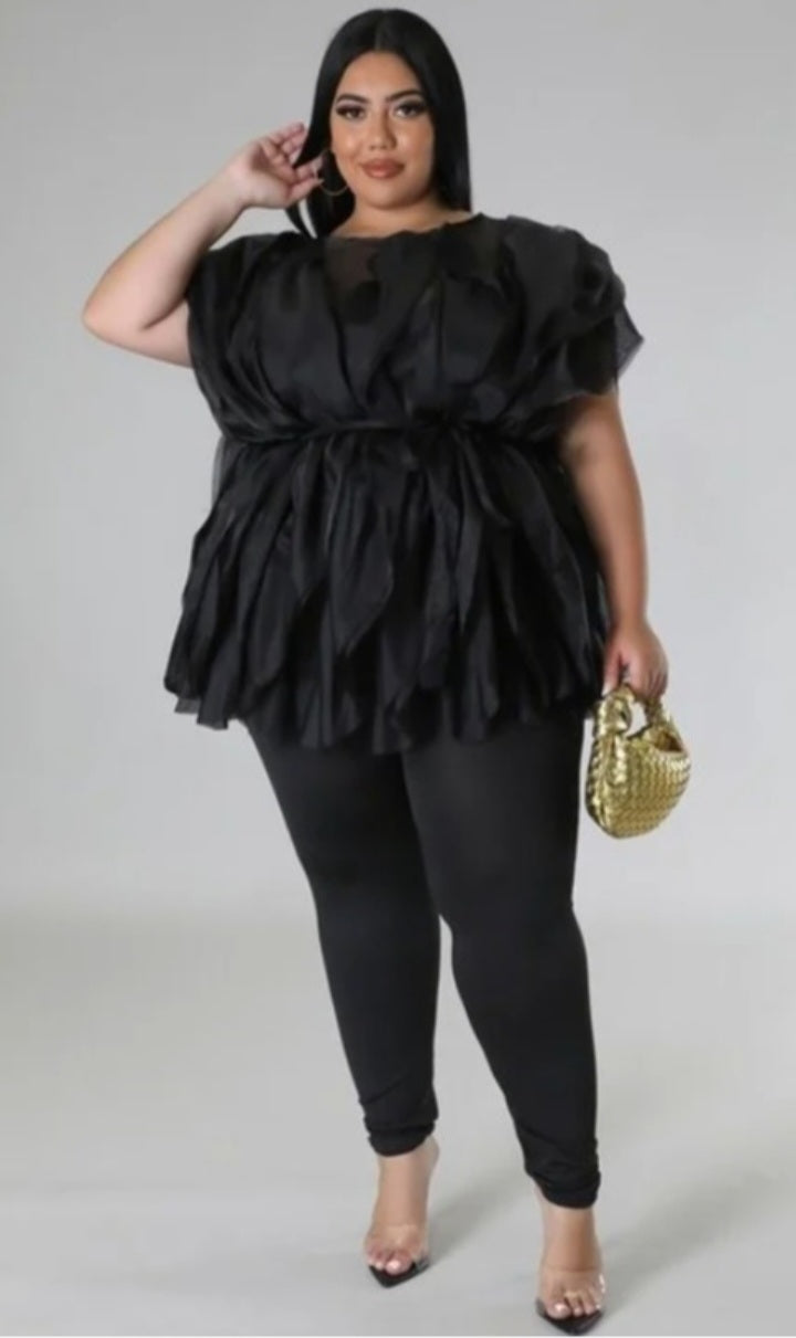 Two piece set, Round neckline, Neck self tie closure, Belt included, High waisted pants, Elastic waistband, No closure.
